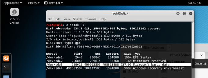 4) Next go into you files folder, click on other locations and click on the windows disk and a disk icon should pop up in the top left corner. Right click on the icon and click open terminal.