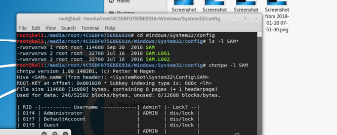 Next we need to see the SAM files. SAM stands for Security Account Manager this is where windows it stores user passwords. Enter