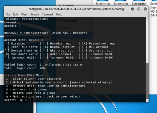 7) This will bring you to this screen and from here you can choose from a number of options. To clear a password just type 1 and then hit enter, but as you can see you can do other things as well, but for now just clear the password . After pressing one type q then enter to exit out and click y to save changes.